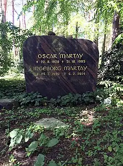 As a Jewish emigrant, he lived in the US and was sent to Germany after World War II as a film officer. In 1955, Oscar Martay marries Renate Barken (1920–2014),[8] a German actress. He dies in 1995.[2] They have 2 sons, Kenneth Andreas (1956) is an associate professor of anesthesiology at the University of Washington, and Manuel (1960) is a social worker living in Germany. Oscar and Ingeborg Martay are buried in the Waldfriedhof Zehlendorf Berlin Germany.[9]