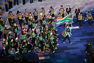 In the first semi-final of the 4 × 400 metres relay race on 9 August, the second leg runner of the South African team, Ofentse Mogawane, fell and was injured before reaching the third leg runner, Pistorius. South Africa was passed into the final on appeal to the IAAF, due to interference by Vincent Kiilu, the Kenyan athlete who downed Mogawane.[102][103] The South African relay team eventually finished eighth out of the field of nine in the final on 10 August. However, it established a season's best time for the team of 3 minutes 3.46 seconds,[104] with Pistorius running the final leg in 45.9 seconds.[105] Pistorius was chosen to carry the South African flag for the closing ceremony.[106]