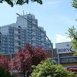 Osdorfer Born was often described as "deprived area" or "social hotspot" (German: "sozialer Brennpunkt"). The proportion of welfare recipients and migrants is each about 20 percent, unemployment was rising during the 2000s.[3] On the other hand, the district authorities recently adopted several measures to improve the quality of living and the social environment.[4]