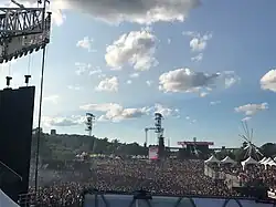 The Osheaga Music and Arts Festival (French: Festival musique et arts Osheaga) is a multi-day music festival in Montreal, Quebec, that is held every summer at Parc Jean-Drapeau on Île Sainte-Hélène. The festival takes place on six stages with various audience capacities. Translated from their French equivalents, they are called "River Stage", "Mountain Stage", "Green Stage", "Trees Stage", "Valley Stage", and "Zone Piknic Electronik". Each performance area is paired with a sponsor. Band set times fluctuate based on the status of the performer within the festival. Emerging artists play 30-minute sets, and headliners conclude each day with 90-minute plus sets.[2] The 2006 festival attracted a crowd of around 50,000 people. The 2012 festival reached its 80,000 attendance capacity each day.[3]