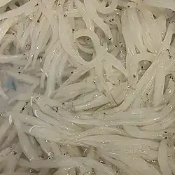 The Osmeriformes /ɒsˈmɛrɪfɔːrmiːz/ are an order of ray-finned fish that includes the true or freshwater smelts and allies, such as the noodlefishes; they are also collectively called osmeriforms. They belong to the teleost superorder Protacanthopterygii, which also includes pike and salmon, among others.[2] The order's name means "smelt-shaped", from Osmerus (the type genus) + the standard fish order suffix "-formes". It ultimately derives from Ancient Greek osmé (ὀσμή, "pungent smell") + Latin forma ("external form"), the former in reference to the characteristic aroma of the flesh of Osmerus.[3][4][5]