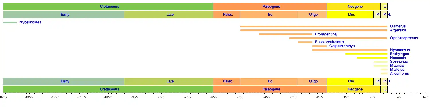A possible fossil osmeriform is Spaniodon, a piscivore from Late Cretaceous seas.[9] The group originated probably somewhat earlier, but a Cretaceous age maybe about 110 million years ago or so is likely.[5][7] The oldest definite osmeriform is Speirsaenigma from the Paleocene of Alberta, Canada, which was a relative of the modern ayu fish and appears to have been a freshwater species.[14][15] In 2025, a new, extinct family of freshwater Southern Hemisphere smelt, the Ferruaspidae, was identified from the Miocene-aged McGraths Flat fossil site of Australia.[13]