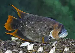 Like other gouramis, the members of the genus Osphronemus are able to breathe by gulping air from the water's surface. Compared to other gouramis, their suprabranchial organ is highly elaborate, leading to speculations that they also may be able to detect smells in the air. This might help them to find the land vegetation that they feed on.[4] They feed mostly on fruits, seeds, leaves, flowers, bark and roots from land plants, macrophytes and algae, but will also take small animals like insects, worms, crustaceans, fish and amphibians.[6][7][8][9][10] Unlike the other species, adult O. exodon have quite conspicuous teeth on the outside of their lips.[3] This species often occurs in flooded forests,[11] and it will jump out of the water to pick fruits from overhanging branches.[12] Its unusual teeth may also be useful when feeding on roots and when building its nest.[9]