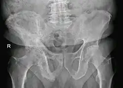 Paget's disease of bone (commonly known as Paget's disease or, historically, osteitis deformans) is a condition involving cellular remodeling and deformity of one or more bones. The affected bones show signs of dysregulated bone remodeling at the microscopic level, specifically excessive bone breakdown and subsequent disorganized new bone formation.[1] These structural changes cause the bone to weaken, which may result in deformity, pain, fracture or arthritis of associated joints.[1]