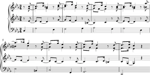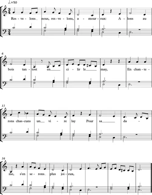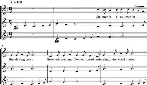 Later in the medieval era, Guillaume Dufay's 15th-century chanson Resvelons Nous features a similarly constructed ostinato pattern, but this time 5 bars long. Over this, the main melodic line moves freely, varying the phrase-lengths, while being "to some extent predetermined by the repeating pattern of the canon in the lower two voices."[8]