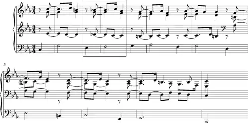 The first variation that Bach builds over this ostinato consists of a gently syncopated motif in the upper voices: