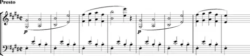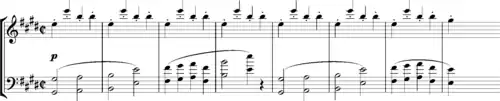 In the energetic Scherzo of Beethoven’s late C sharp minor Quartet, Op. 131, there is a harmonically static passage, with "the repetitiveness of a nursery rhyme"[14] that consists of an ostinato shared between viola and cello supporting a melody in octaves in the first and second violins: