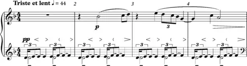 Debussy featured an ostinato pattern throughout his Piano Prelude "Des pas sur la neige". Here, the ostinato pattern stays in the middle register of the piano – it is never used as a bass. "Remark that the footfall ostinato remains nearly throughout on the same notes, at the same pitch level... this piece is an appeal to the basic loneliness of all human beings, oft-forgotten perhaps, but, like the ostinato, forming a basic undercurrent of our history."[15]