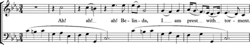 While the use of a descending chromatic scale to express pathos was fairly common at the end of the seventeenth century, Richard Taruskin pointed out that Purcell shows a fresh approach to this musical trope: "Altogether unconventional and characteristic, however, is the interpolation of an additional cadential measure into the stereotyped ground, increasing its length from a routine four to a haunting five bars, against which the vocal line, with its despondent refrain ("Remember me!"), is deployed with marked asymmetry. That, in addition to Purcell's distinctively dissonant, suspension-saturated harmony, enhanced by additional chromatic descents during the final ritornello and by many deceptive cadences, makes this little aria an unforgettably poignant embodiment of heartache."[12] See also: Lament bass. However, this is not the only ostinato pattern that Purcell uses in the opera. Dido's opening aria "Ah, Belinda" is a further demonstration of Purcell's technical mastery: the phrases of the vocal line do not always coincide with the four-bar ground: