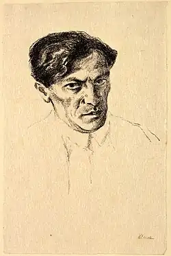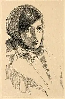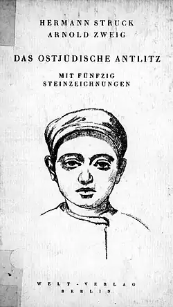 Another key figure in what has been called the "cult of the Ostjuden"[50] is the German Jewish writer Arnold Zweig. Influenced by Buber's Hasidic writings, Zweig felt alienated from both institutional German Judaism and official Zionism.[61] His 1920 book Das ostjüdische Antlitz ("The Eastern Jewish Face"), featuring illustrations by Hermann Struck, stated: "This book speaks of the Eastern Jews as someone who has tried to see them".[62] Struck's beautifully crafted portraits challenged the prevailing stereotype by showing that "The Eastern Jewish countenance was not hideous nor depraved but reflected beauty, hidden strength, and great sensitivity".[63]