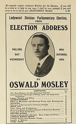 Mosley was first encouraged to enter politics by F. E. Smith, 1st Earl of Birkenhead.[28] By the end of the First World War Mosley, aged 21, had decided to go into politics as a member of Parliament, as he had no university education or practical experience because of the war. He was driven by, and in Parliament spoke of, a passionate conviction to avoid any future war, and this seemingly motivated his career. Uninterested in party labels, Mosley primarily identified himself as a representative of the "war generation" who would aim to create a "land fit for heroes."[29] Largely because of his family background and war service, local Conservative and Liberal associations made appeals to Mosley in several constituencies.