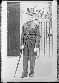 Mosley considered contesting the constituency of Stone in his home county of Staffordshire, but ultimately chose the Conservative stronghold of Harrow, for it was closer to London and, as Mosley claimed, a seat that he sought to win on his own merits, free from family connections.[30] On 23 July 1918 Mosley competed with three other candidates for the Conservative nomination at the upcoming general election. Though his 15-minute speech "fell flat," Mosley won over the 43 delegates with the "lucid and trenchant manner" in which he answered their questions.[30] Mosley's opponent in the parliamentary election was an independent, A. R. Chamberlayne, an elderly solicitor who complained that the well-connected, wealthy Mosley was "a creature of the party machine" and too young to serve as a member of Parliament.[30] Mosley retorted that many of Britain's greatest politicians entered Parliament between the ages of 19 to 25, such as Charles James Fox, William Pitt the Younger, William Ewart Gladstone, Henry John Temple, 3rd Viscount Palmerston and Robert Gascoyne-Cecil, 3rd Marquess of Salisbury.[31] Mosley chose red as his campaign colour rather than the traditional blue associated with conservatism.[32] Mosley easily defeated Chamberlayne with a majority of nearly 11,000.[33]
