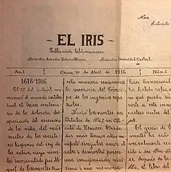 From 1907 to 1914 Castro attended El Vergel, a private school founded and directed by Raymundo Aveiga Moreira (1876–1959),[2] in Chone, Ecuador. At fourteen, under the tutelage and guidance of his teacher and with several of his schoolmates, most notably Enrique Amadeo Bolaños Moreira (1898–1929), he edited and wrote articles for Chone's first cultural weekly, El Iris. The only newspaper available in Chone at the time was El Horizonte,[3] a weekly published in Portoviejo, the capital of Manabí province. El Iris was launched on April 23, 1916, its few copies painstakingly handwritten for lack of a printing press.[4] Good penmanship was a highly desirable and respected skill at the time and was part of El Vergel's eight-year curriculum along with the more traditional subjects. El Iris' readership consisted of a few families arbitrarily selected by the young publishers. There arose an aura of suspense every week among these families to see if they would be the ones to receive the prized manuscript. Many years later during a visit by cultural historiographer, Horacio Hidrovo Peñaherrera, Columba Coppiano Delgado was able to produce a pristine copy of El Iris destined specifically to her by the young journalists.[5] Items of interest were gathered from the private library of Guadalupe Martínez de Santos, a wealthy Mexican actress and neighbor; from illustrated magazines arriving from Europe which the boys were allowed to read at the post office before their patrons picked them up; and from news-about-town submitted by collaborating young itinerant reporters. Examples of these diverse topics were: the tercentenary of Miguel de Cervantes (most probably written by Bolaños); La Galerna, an account of the gales besetting the Cantabrian Sea (written by Castro),[6] social, literary, humor, and daily life columns, as well as updates on World War I. The students took sides: some for the Triple Alliance, some for the Triple Entente; that is to say, Germanophiles versus Francophiles. After perhaps seven issues and the acquisition of a printing press generously donated by Colonel Juan Crecencio Álvarez Loor, El Iris was taken over by the Centro Social Juventud Chonense.[7][8][9][10] By 1921, it was a well-established popular semanario chonense under the directorship of Ramón Verduga Cornejo.[11] Due to the exodus of many of its writers, El Iris folded in 1935.[10]
