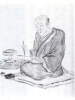 ![]() Depiction of Ōtagaki Rengetsu at a high age, writing | |