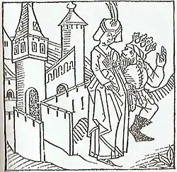 Attempts to derive the story or the figure of Ortnit from Germanic myth or historical personages have not been successful.[13][14][12] The many German bride-quest stories, which include Ortnit, König Rother, Orendel and Salman und Morolf, have their roots in late Merovingian history: chronicles contain a number of self-contained bride-quest stories, based ultimately on the Frankish King Clovis I's wooing of Clotilde in 492.[15] All involve a hero travelling to a foreign country to win a bride.[16]