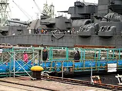 Filming for Yamato took place from March to June 2005 at a closed-down shipyard of Hitachi Zosen Corporation in Onomichi, Hiroshima Prefecture. Approximately JPY 600 million was spent in building a 1:1 scale set of the forward section and the portside anti-aircraft guns. The starboard side, aft section, and the barrels of the A turret were not built since the film only required scenes on the port side. However, compliance issues with Japan's Building Standards Act prevented the reproduction of the Yamato's pagoda tower. Instead, photographs of the Yamato Museum's own 1:10 Yamato model was used for post-production. The interior scenes were made on a sound stage, but a hall near the set shows the various rooms and props reproduced for the film.