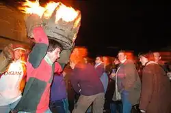 The festivities begin in the early evening with children's, youths' and women's events, culminating in the men's event when a total of 17 barrels are lit outside each of the four public houses in the town. (Originally there were 12 public houses in the town). The barrels, increasing in size up to 30 kg, are carried through the town centre, often packed with onlookers, in an exhilarating and risky spectacle. Only those born in the town, or who have lived there for most of their lives, may carry a barrel.[32] Generations of the same family have been known to compete across the years and it is thought that the event may have originated as a means of warding off evil spirits, similar to other British fire festivals, around the time of Halloween. In recent years the event has been jeopardised by the need for increasing public liability insurance coverage. Nevertheless, the event continues and the town of 7,000 people increases to well over 10,000. During the event all roads in and out of Ottery are closed for safety reasons with diversions in place.[33]