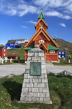 Memorial plaque in Paamiut, Greenland. Text in Greenlandic and Danish: "He loved the Greenlanders; Taught them about the living God; Lived with them in everything; Was the hunters' equal in courage on the sea; Taught the scholars about the animals and language of our country"