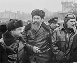 Otto Schmidt (centre) with Captain Ivan Papanin (left) and Mikhail Vodopyanov (right) in 1938