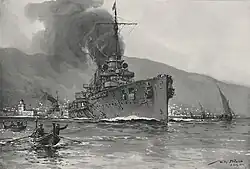 On the evening of 27 October 1914, Midilli and the rest of the Ottoman fleet left the Bosporus and steamed into the Black Sea, ostensibly to conduct maneuvers. Instead, the fleet split into four groups to attack Russian bases on the other side of the Black Sea; Midilli and another cruiser were tasked with mining the Strait of Kerch and then attacking the port of Novorossisk.[18] Midilli laid sixty mines in the Strait,[19] which later claimed two Russian merchant ships,[20] and then joined the other ship in bombarding Novorossisk. They set the port's oil tanks on fire, damaged seven merchant ships, and sank Nikolai of 1,085 gross register tons (GRT).[19] Although the damage inflicted on the Russians was relatively light, it forced the Russians to declare war on the Ottoman Empire, bringing the country into the war on the side of Germany.[21]