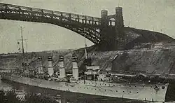 On 3 April, the Ottoman fleet sortied to attack Russian transports off Odessa. Midilli and Yavûz Sultân Selîm provided the covering force for the attack, which failed after the cruiser Mecidiye struck a mine and sank off Odessa. The Russian fleet attempted to intercept the Ottoman force, but Midilli and Yavûz Sultân Selîm were able to escape undamaged. The two ships, joined by Hamidiye, conducted a sweep to attack Russian transports on 6 May, but found no targets.[27] Later that month, detachments of naval infantry from Midilli and Yavûz Sultân Selîm were landed to assist in the defense against the Allied landings at Gallipoli.[28] On the night of 10/11 June, Midilli encountered the Russian destroyers Derzky and Gnevny off Zonguldak. In a brief firefight, the cruiser crippled Gnevny with a hit in her starboard engine compartment that broke the main steam line to the engines, but was forced to turn away when Gnevny fired five torpedoes at her. Midilli was hit by gunfire seven times herself with only slight damage and Gnevny was towed back to Sevastopol the following day by Derzky.[29][30]