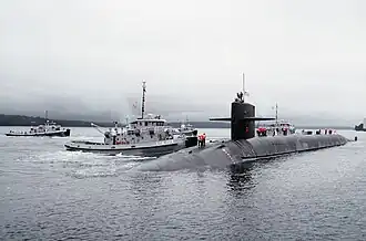 ![]() Ottumwa and Manhattan (YTB-779) assist in the docking of the nuclear-powered ballistic missile submarine USS Ohio (SSGN-726) at Delta Pier, Naval Submarine Base Bangor, WA.