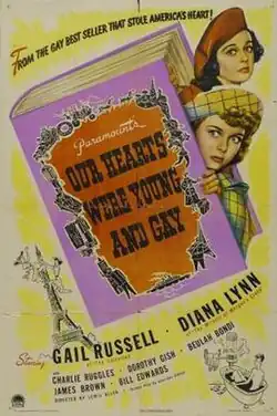 Our Hearts Were Young and Gay is a 1944 American comedy film directed by Lewis Allen and written by Sheridan Gibney. It was based on the real life reminiscences of the comic misadventures of Emily Kimbrough and Cornelia Otis Skinner in their book Our Hearts Were Young and Gay.[1] The film stars Gail Russell, Diana Lynn, Charlie Ruggles, Dorothy Gish, Beulah Bondi, Bill Edwards and James Brown. After its premiere in New York on October 12, 1944, Our Hearts Were Young and Gay went into general release.[2]