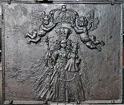 As a form of devotion to our Lady of Luxembourg, Takenplatte or firebacks were moulded with her image. They usually depict the Virgin Mary with the Child Jesus, holding a scepter, keys and high crown. Her veil falls down to the ground as a bridal symbol. Above Mary, putti hold a crown of clasps over her crowned head.