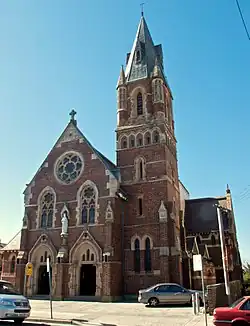 The church is situated in Avoca Street, Randwick, adjacent to the commercial centre of the area. It was designed by Sheerin and Hennessy in a Gothic Revival style and built in 1888. It consists predominantly of brick with sandstone trimmings, with a spire on its southern side. Inside, there is a trussed timber roof and a stained-glass window behind the altar. A Gothic-style octagonal chapel and shrine are located near the altar.[2]