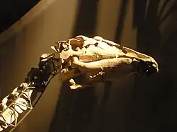 The skull of Ouranosaurus is 67.0 cm (26.4 in) long. It was rather low, being 24.4 cm (9.6 in) wide and only 26.0 cm (10.2 in) tall. The top of the skull was flat, the highest point being just in front of the orbits and sloping down towards both the rear of the skull and the tip of the snout.[1] This makes Ouranosaurus have the most elongate skull of any non-hadrosaurid, the length being 3.8 times the maximum height, although the skull is proportionally wider than related Mantellisaurus.[3]