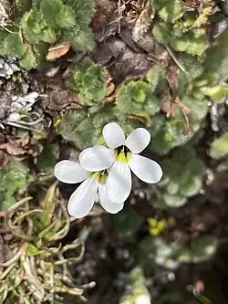 Ourisia simpsonii is morphologically similar to other New Zealand small-leaved species, namely O. sessilifolia, with which it shares the subrosette or rosette habit, ovate to very broadly ovate or obovate to very broadly obovate leaves, irregular white corollas, and having a mixture of glandular and non-glandular hairs on many plant parts.[1][5]