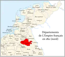 Ourthe (French pronunciation: [uʁt] ⓘ; Dutch: Ourte; German: Urt) was a department of the French First Republic and French First Empire in present-day Belgium and Germany. It was named after the river Ourthe (Oûte). Its territory corresponded more or less with that of the present-day Belgian province of Liège and a small adjacent region in North Rhine-Westphalia in Germany. It was created on 1 October 1795, when the Austrian Netherlands and the Prince-Bishopric of Liège were officially annexed by the French Republic.[4] Before this annexation, the territory included in the department had lain partly in the Prince-Bishopric of Liège, the Abbacy of Stavelot-Malmedy, the Duchies of Limburg and Luxembourg, and the County of Namur.