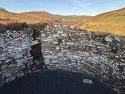 The main entrance is on the southwest, and the passageway, which retains almost all of its original roofing lintels, measures 4.3m long, 1.78m high, and 75 cm in width.[4] The entrance passage contains two sets of door-checks, and there is also a guard cell.[2] The central court has an internal diameter of around 7m, and there is a doorway leading to an intramural stairway, similar to those still surviving at Mousa on Shetland and Dun Telve near Glenelg.[4]