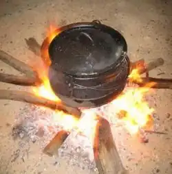 Alternatively, a fireproof container (e.g. mess can, bamboo segment or improvised tree bark pot) is placed (or hung) above the fire.