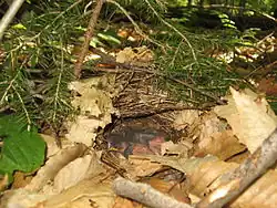 The placement of the nest on the ground makes predation by snakes, red squirrels, and chipmunks (Tamias) a greater concern than for tree-nesting birds. Chipmunks have been known to burrow directly into the nest to eat the young birds.[3] The female can perform a distraction display, simulating an injured bird, when a potential predator is in the vicinity of the nest.[24]