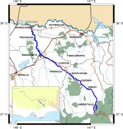 Formed by the confluence of the East and West Branches of the river, the Ovens River rises in the Victorian Alps, at the settlement of Harrietville, sourced by runoff from high slopes located within the Alpine National Park and the Mount Buffalo National Park. The river flows generally north by west and is joined by eighteen tributaries including Morses Creek at Bright, the Buckland River at Porepunkah, the Buffalo River and then the King River at Wangaratta. The river descends 405 metres (1,329 ft) over its 191-kilometre (119 mi) course.[4] The Great Alpine Road follows much of the course of the river in its upper reaches.[4]