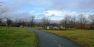 The Henry Hoebel Area consists of a small playground, a 9/11 World Trade Center Memorial, bicycle and jogging path, and track and field. There are six tennis courts, baseball and soccer fields, and two practice backstops. The bicycle-pedestrian path is approximately one and a quarter-mile long and it forms a figure-8, dividing the Henry Hoebel Area into two sections, separated by a tributary of the Overpeck Creek.[4] There is also a dog park.