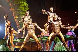 - Volants (Scarabs): Using two trapezes on either side of the stage, the scarabs are thrown onto a platform suspended above the centre of the stage, where they are caught and thrown in a banquine-style discipline. This act was replaced by aerial cradle during the arena conversion in 2015.