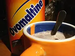 Ovaltine, also known by its original name Ovomaltine, is a brand of milk flavouring product made with malt extract, sugar (except in Switzerland), and whey. Some flavours also have cocoa. Ovaltine, a registered trademark of Associated British Foods, is made by Wander AG, a subsidiary of Twinings, which acquired the brand from Novartis in 2002,[1] except in the United States, where Nestlé acquired the rights separately from Novartis in the late 2000s.