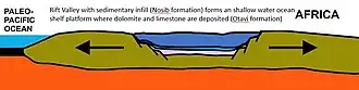 The breakup of Rodinia (Late Precambrian) is the origin of the original depositional series of the Owambo Basin. The rifting apart of the Congo Craton from the Rodinean shallow sea created a classic pull-apart basin. Pull-apart basins are characterized by faults that create an area of crustal extension, causing uplift at the edges and a sinking of the center, which is infilled by sediment or, in this case, a shallow sea (See Image 3).[4] The deposition of the Nosib Formation (900-750 Ma) is the original deposition from the mass wasting of the newly uplifted edges of the Congo Craton, followed by the Otavi Formation (750-650 Ma), composed of dolomite and limestone from the formation of the shallow sea.[1]