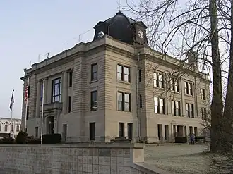 The Owen County Courthouse is a historic courthouse located at Spencer, Owen County, Indiana, United States. It was the work of Jesse Johnson and Christian Kanzler & Son and built in 1910–1911. It is a three-story, with basement, Classical Revival style limestone building. The flat roof is topped by a copper dome with four-sided Seth Thomas clock.[2]: 5