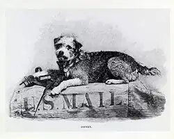Owney (ca. 1887 – June 11, 1897) was a terrier mix[1] adopted in the United States as a postal mascot by the Albany, New York, post office about 1888. The Albany mail professionals recommended the dog to their Railway Mail Service colleagues, and he became a nationwide mascot for nine years (1888–1897).[2] He traveled over 140,000 miles throughout the 48 contiguous United States and around the world as a mascot of the Railway Post Office and the United States Postal Service. He was the subject of commemorative activities, including a 2011 U.S. postage stamp.[3]
