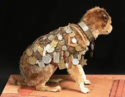 Owney received tags everywhere he went, and as he moved they jingled like sleigh bells.[1] As the tags accumulated, he was given a jacket to hold them so that their weight would not injure his neck or shoulders. Once the tags became too heavy for Owney to carry even with the help of the jacket, clerks adding tags would remove others and forward them to Albany or Washington D.C. for safekeeping. One source suggests that 1,017 medals and tokens were bestowed upon the mascot, but the exact number is unknown.[7] Some of these tags did not survive; the National Postal Museum currently has 372 Owney tags in its collections.[5] Other Owney tokens, trinkets, and medals are also in the NPM collection and are displayed there.[5]