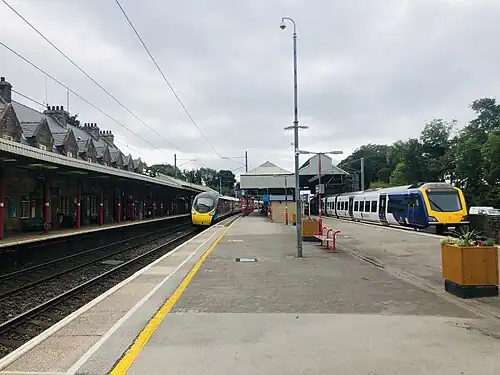 Oxenholme Lake District railway station serves the village of Oxenholme, near Kendal, in Cumbria, England. It is a stop on the West Coast Main Line and is the south-eastern terminus of the branch line to Windermere. The station is managed by Avanti West Coast and is owned by Network Rail.[2]