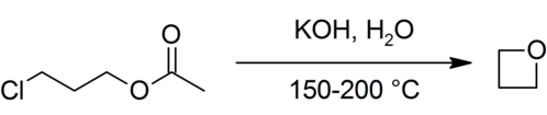 Yield of oxetane made this way is c. 40%, as the synthesis can lead to a variety of by-products including water, potassium chloride, and potassium acetate.