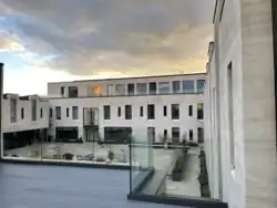 The long but narrow third quadrangle adjoins Ship Street, on the north of the site and to the west of the garden of the principal's lodgings, where the college has owned some land since its foundation. In the 18th century, this was home to the college stables. A fire in 1904 led to the demolition of the stables and the gateway to Ship Street.[68] Replacement buildings adjoining Ship Street, effectively creating a third quadrangle for the college, were constructed between 1906 and 1908.[69] It contained the college's science laboratories (now closed) and a new gate-tower, as well as further living accommodation and a library for students, known as the Meyricke Library, after a major donor – there had been an undergraduate library in the second quadrangle since 1865, known as the Meyricke Library from 1882 onwards.[68][69]