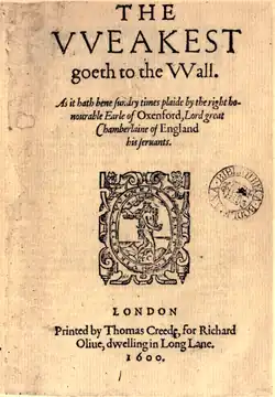 Edward de Vere, 17th Earl of Oxford (1550-1604), was an enthusiastic and persistent promoter of theatrical companies, and was himself known as a playwright.[11] He sponsored both adult and boys' acting companies, and it is difficult to distinguish between their performance records.[12] He also sponsored a Christmas 1584 court performance of tumbler John Symons and his group of acrobats between his tenure with Lord Strange's Men and Queen Elizabeth's Men.[13]