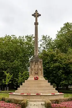 The eight faces of the plinth bear carvings within recessed niches. The south face has a carved shield bearing the inscription "IN / MEMORY / OF / THOSE WHO / FOUGHT AND/ THOSE WHO / FELL / 1914–1918". Later added to the second step is the inscription "AND / 1939 – 1945" and on the fourth step: "AND ALL OTHERS WHO HAVE GIVEN THEIR LIVES / IN THE SERVICE OF THEIR COUNTRY". The main inscription on the face of the memorial cross has become worn, and further inscriptions were added to the top step in 2016, adding "FOR THOSE WHO FOUGHT", "1914–1918", "AND THOSE WHO FELL".