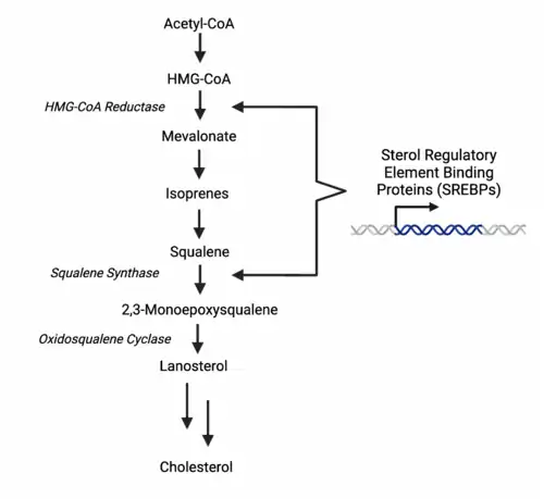 The enzyme’s genetic expression in animals is regulated by sterol regulatory element binding protein (SREBP-2), a molecule which also regulates the expression of other enzymes in the cholesterol biosynthesis pathway.[9] The SREBP-2 transcription factor increases enzymatic activity upstream of OSC, such as that of HMG-CoA reductase and squalene synthase, to increase flux through sterol synthesis process.[10]