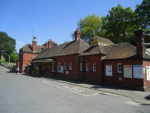 The station opened on 2 February 1885 as Oxshott and Fairmile.[1] At that time the village was, as Fairmile remains, just a hamlet without place of worship. The brickfields here were served by a short siding from the station. These supplied bricks for many London buildings in the late 19th and early 20th centuries.[2]